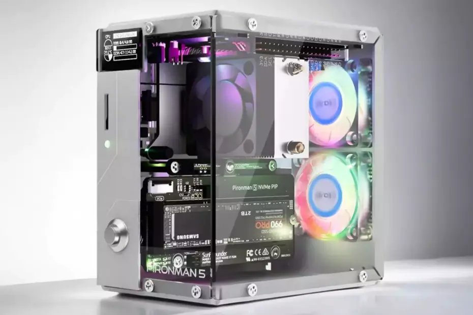 Der Pironman 5 ist ein Mini-Tower-Gehäuse mit CPU-Kühler und RGB-Lüftern. Mit dabei sind ein Gehäuse, OLED-Display, CPU-Kühler, Lüfter und ein SSD-Adapter.
