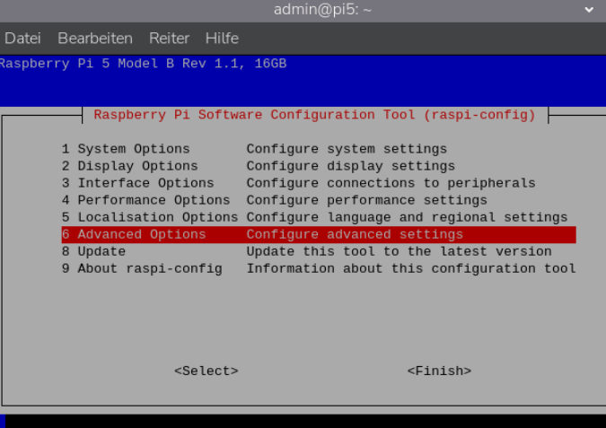 Dann gehen wir mit den Pfeiltasten zu Punkt 6 Advanced Options.